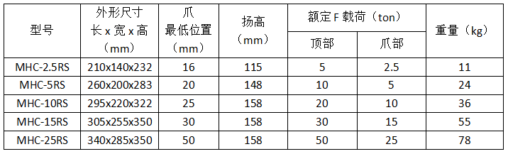 1、本系列產(chǎn)品目前共有五種規(guī)格:MHC-2.5RS、MHC-5RS、MHC-10RS、MHC-15RS、MHC-25RS。廣泛適用于機(jī)械設(shè)備、橋梁建筑、鐵路軌道等方面的安裝和維修;交通運輸?shù)闹匚镅b卸;汽車拖拉機(jī)修理等方面。